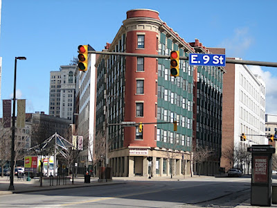 Heading back through town on E 9th Street (part of which is now called "Rock & Roll Boulevard"), there are some areas where they have tried to add a touch of character, but for the most part it had a pretty grim, empty feel. Maybe it's the weather, but I tend not to think that's the only reason.